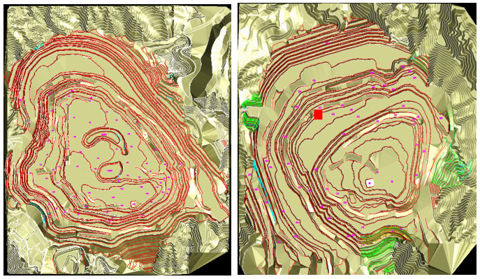 圖1-利用DIMINE構(gòu)建包含地形、礦體、邊坡等要素的三維實體模型